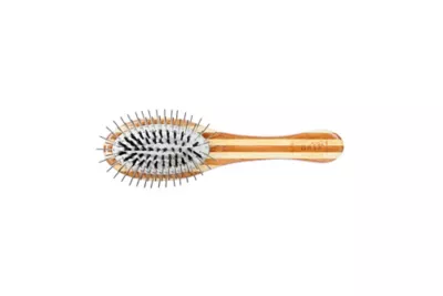 - Purse-sized oval shape with molded pins, wild boar bristles, and 100% bamboo wood handle