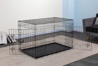 - Folding, suitcase-style crate for dogs
