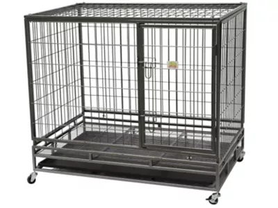 - Crate for dogs features a heavy-duty steel wire cage body and metal square tubing as a frame