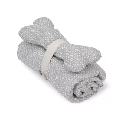 Throw it on the sofa or take it on a trip, this ultra-soft double-sided blanket is snuggly. One side features a cloud-soft Sherpa fabric in a neutral color and the other side features a soft cotton fabric. This blanket is machine washable and comes with a matching 8″ Squeaky Bone Toy that is double stitched and will provide hours of fun.