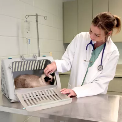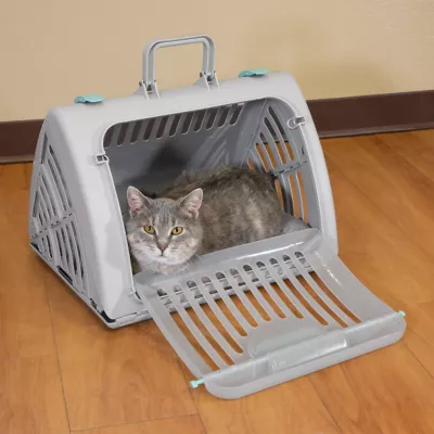 Finally a cat carrier that is designed specifically for cats. The SportPet Travel Master Cat Carrier is the last cat carrier you will ever need. The key feature is the carrier’s door with a wide side-opening gate that cats feel comfortable walking into. The carrier’s gate can be smoothly shut; quickly and safely keeping you and your pet safe and happy. Numerous veterinarians and reviewers have commented about the door design making life easier. “Working with a cat has become so much easier”, we often hear. Less stress on the cat. Easy transport for the cat owner. Easy handling for the veterinarians. The quality of the tooling is outstanding. The body of the cat carrier is made out of an impact resistant polypropylene. The latch and door are high strength premium Polycarbonate. The cat carrier easily folds down for storage. This handy portable crate can be stored nearly anywhere; closet, car, fits easily in a cabinet. A standard dog kennel or carrier takes up too much space. Our cat carrier is the best pet porter on that we have seen in the market. The Cat Carrier also has plenty of ventilation. The ventilation slats are designed to have smooth rounded edges and are wide enough for your pet to have enough visibility to stay calm and safe. Our Cat Carrier is sturdy. Convenience did not come at a cost to quality or durability. Works great for large cats. Carry handle is smooth and solid. Metal hardware pins the handle in place. Works well for small dogs. Also works great as a small animal carrier. We find that our wide carrier door works far better with small animals than a dog crate. Use our carrier for Rabbits, Ferrets, Guinea Pigs, some tortoise and turtles have also done well in the Cat Carrier. Use our Cat carrier as a convenient pet taxi for cats, puppies, and small animals. Easy to clean. We all know accidents sometimes happen. The wide door makes clean up easy.