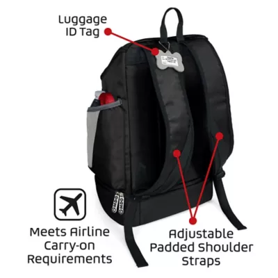 - Pet travel bag features large main storage, two padded back straps, luggage ID, and waste bag pocket