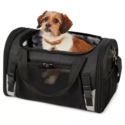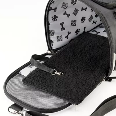 - FEATURES – 2 food carriers, 2 collapsible dog bowls, placemat, pocket, collar tether, top/side entry