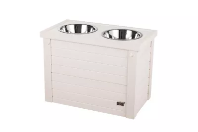 - Includes 2 removable stainless-steel dog bowls with this pet feeder station