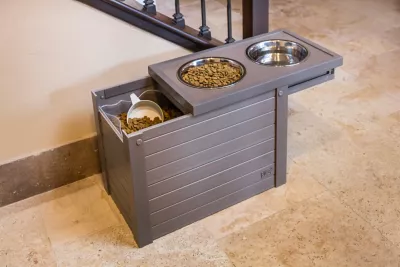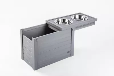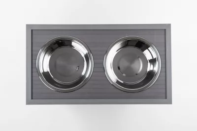 - Includes 2 removable stainless-steel dog bowls with this pet feeder station