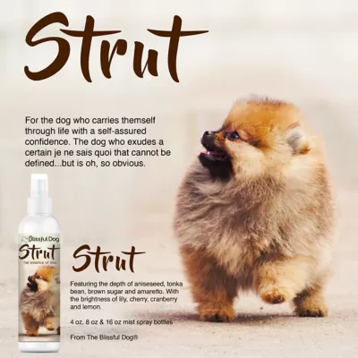 The Blissful Dog Strut Canine Cologne spray for the dog who saunters through life with self-assured swagger. This dog exudes a certain je ne sais quoi that cannot be defined…but is oh, so obvious. Strut is for the dog who oozes self-confidence. The dog who knows they are the ruler of their kingdom and handles that responsibility with a deft touch. Appropriate for boy dog or girl, day or night, for toy dog or terrier…Strut is all about attitude. This is a more opulent, richer fragrance. Think L’Homme Ideal by Guerlain or Diesel Loverdose Tattoo. Strut shares the depth of anise seed, tonka bean, brown sugar and amaretto. With a wee bit of the brightness of lily, cherry, cranberry and lemon. It is the perfect addition to your dog grooming assortment. Strut is attitude, charisma and swagger.