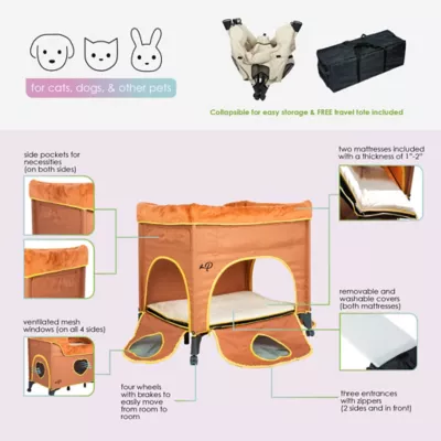 - Three zippered doors with ventilated mesh windows – Open one zipper door to imitate a comfortable natural habitat your pets are accustomed to – Open all three zipper doors so your pets can have fun running in and out – Close all three zipper doors to create a comfortable kennel experience for your pets to tone down