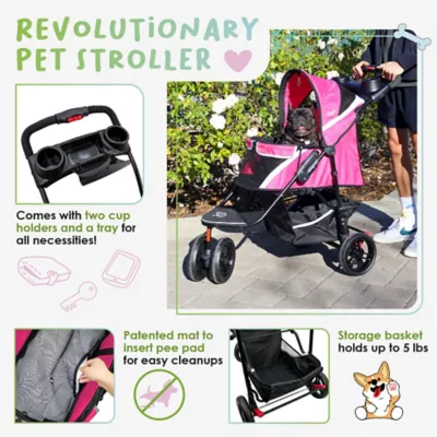 - Large back pockets for cell phone, keys, treats, etc. Convenient and secure cup holder tray that holds up to two cups. Large storage basket holds up to 5 lb.