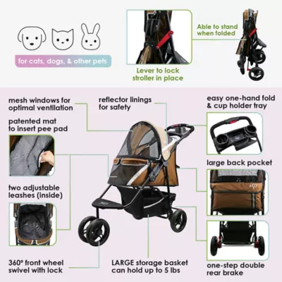 - Large back pockets for cell phone, keys, treats, etc. Convenient and secure cup holder tray that holds up to two cups. Large storage basket holds up to 5 lb.