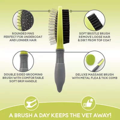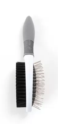 - Double sided brush helps prevent pet hair from getting on your couch, your carpet, on the floor and other areas; one side has rubber padding and synthetic fiber bristles while the other side has wire bristles