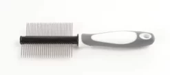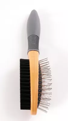 - Double sided comb has a wooden handle and metal bristles