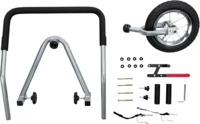 - Bike kit includes a nonslip handlebar, front swiveling wheel and mounting arm, parking brake and all required hardware