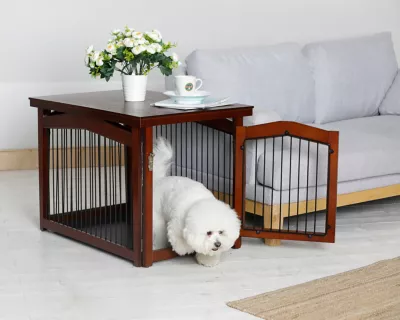 - Crates for small dogs and medium pets are made from MDF with solid wood veneer for durability