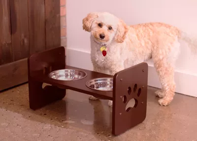 - Adjustable, elevated dog bowls offer rubber bottom pads to prevent sliding